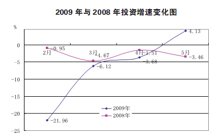 从逐月的变化分析,2008年2~5月份的投资曲线是起伏较小的下降曲线,而2009年2~5月份是一条上升的直线,2009年5月累计投资增长4.13%,较上年同期增加了7.59个百分点,较上个月增加了8.81个百分点,投资已出现回暖的迹象。