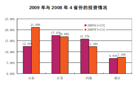 从主要省份的情况分析,山东投资呈现负增长,截止到5月底,投资占比较2008年同期大幅减少,减少了8.65个百分点;江苏改变了2008年减少的情况,投资额有所增加,占比也有所恢复;河南仍然延续了投资高速增长的趋势,同比达到了32.66%,占全国的比重也进一步提高,达到了15.77%;浙江跟山东一样处在减少的趋势,但下降幅度不大,基本持平。