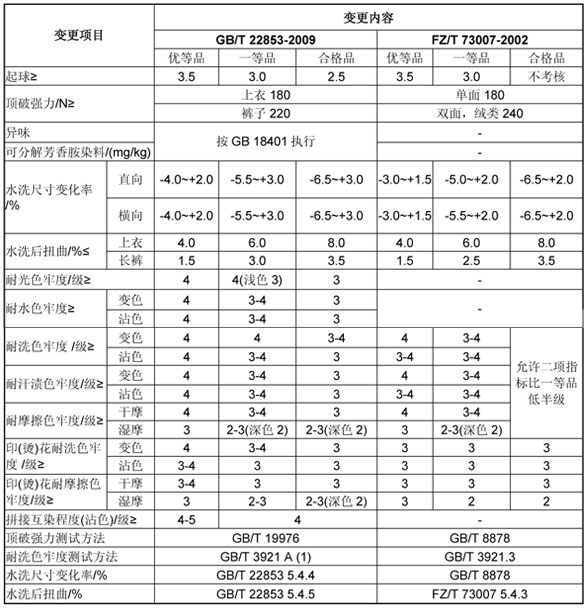 据中华人民共和国国家标准批准发布公告,FZ/T 73007-2002、FZ/T 73008-2002分别更新为GB/T 22853-2009和FZ/T 22849-2009,并将于2009年12月1日正式实施。以下为新旧标准内在质量的详细对比: