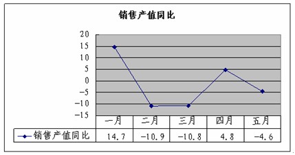 销售方面。2013年(1-5月)上海纺织规模以上工业企业实现销售产值307.65亿元,同比下降1.2%。逐月分析1月份同比上升14.7%,2月份同比下降10.9%,3月份同比下降10.8%,4月份同比上升4.8%,5月份同比下降4.6%,(图3、图4)。1-5月出口降势高于内销,上海纺织企业实现出口交货值74.68亿元,同比下降5%。逐月分析1月份同比上升3.6%,2月、3月同比分别下降14.4%和14.9%。4月、5月与去年同期相比略有下降,分别为:-0.7%-1.5%。