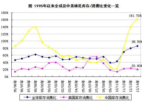 表 1995年以来全球棉花库存消费比变化一览 | |||