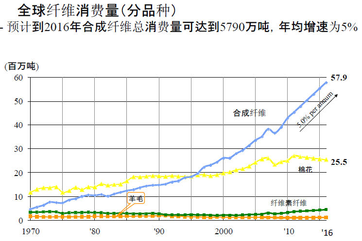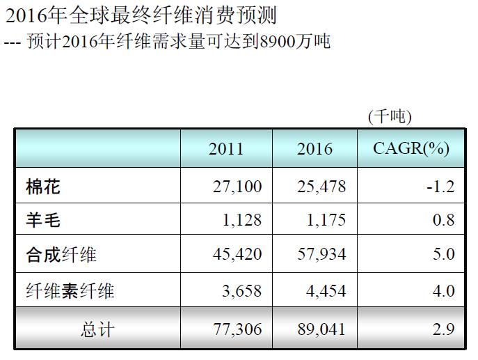 2016年纤维需求预测。2016年我们预测纤维的需求量有望达到8900万吨,年增长率大约是2.9%,其中对于合成纤维的需求有望达到5790万吨,这个增长率是比较快的,它的年增长率是5.0%。而天然纤维需求普遍停滞不前,棉花需求甚至出现1.2%的萎缩。