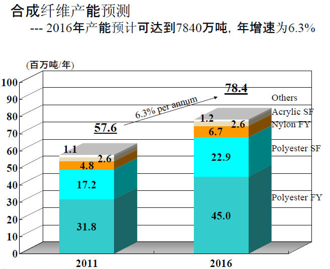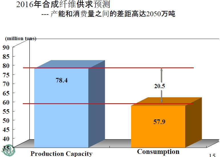 2016年纤维供求平衡预测。合成纤维的产能到2016年有望达到7800万吨,我们的需求并不会增长得这么快,只是停留在5800万吨,所以会出现产能过剩的情况,大概出现了2000多万吨的情况。
