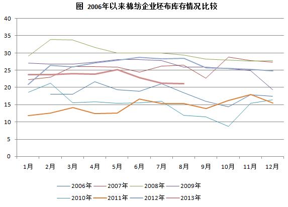调查数据显示,截至8月底,国内棉纺企业平均纱布库存天数分别为20.54天与21.03天,继续维持在较高水平。