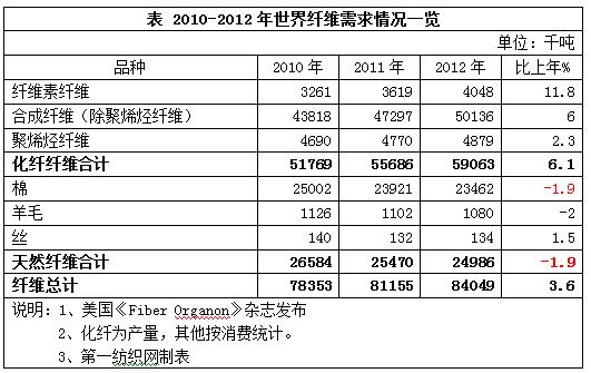 美国的《Fiber Organon》杂志发表了2012年的世界纤维需求情况。2012年的世界纤维需求比上年增长3.6%为8405万吨,自2008年全球金融危机后连续4年增加。其中,化纤增加6.1%为5906万吨,天然纤维萎缩1.9%为2499万吨。化纤所占纤维的比重从2003年的59%扩大至2012年的70.27%,提升了11.27个百分点。