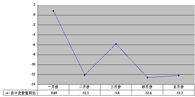 出口方面:2014年1--5月出口交货值完成66.96亿元,同比下降同比下降7.7%,逐月分析1月份同比上升0.84%,2月份同比下降12.1%,3月份同比下降5.8%,4月份同比下降12.6%,5月份同比下降10.1%见(图5)