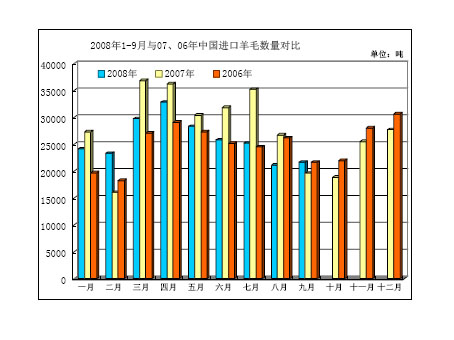 据海关数据统计,2008 年1-9 月我国进口羊毛约23.22 万吨,与上年同比下降10.8%。其中:1 季度进口羊毛7.72 万吨,2 季度进口8.7 万吨,3 季度进口 6.8 万吨。