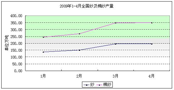 从总体上来看,2009年1-4月我国累计纱产量为670.22万吨,同比增长8.08%。,其中,棉纱产量累计达524.88万吨,同比增长8.78%。今年前4个月我国的纺纱行业还是保持着平稳增长的势头。