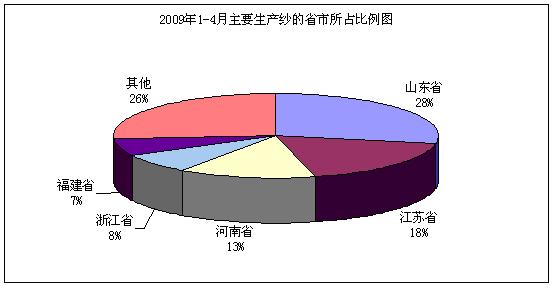 从我国主要纱线生产大省2009年1-4月份累计纱产量的情况来看,我国纱生产企业所在地区较为集中,其中山东、江苏两省为我国传统纺纱大省,两省的纱产量之和占全国的比例达46%,尤其是山东省,其产量已占全国总产量的近1/3。全国生产纱的主要省市所占比例如下: